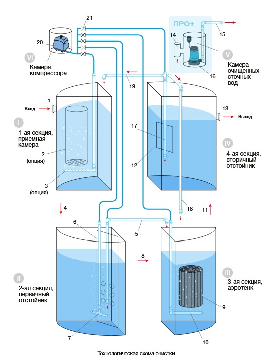 Септик реализует современную технологию переработки стоков, которая обеспечивается комбинацией механической и биологической очистки и включает в себя следующие этапы: