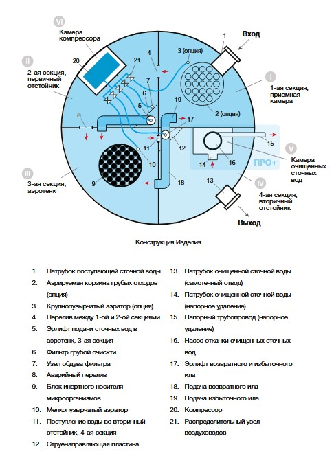 Септик Евролос ПРО выполнен в форме цилиндра и состоит из корпуса и горловины с крышкой. Внутренняя часть корпуса представляет собой емкость, разделенную на четыре отсека. Сообщение между отсека возможно за счет наличия переливов и/или перекачивающих устройств. Внутри секции оснащены легкосъемным технологическим оборудованием. Горловина с крышкой находится в верхней части сооружения и содержит камеру для воздуходувного оборудования.